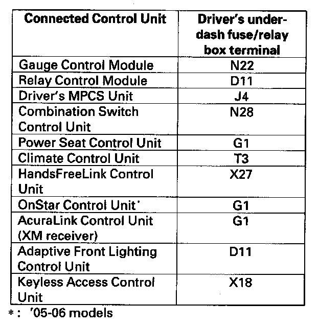 9. Check for continuity between each of the driver's under-dash fuse/relay box terminals listed in the table below and body ground.