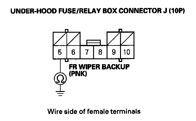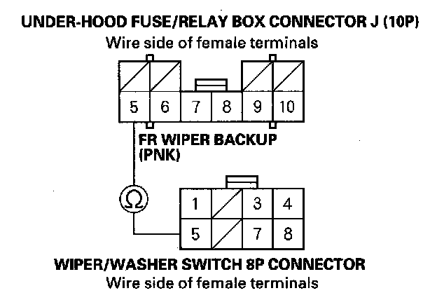 10. Check for continuity between the No. 5 terminal of under-hood fuse/relay box connector J (10P) and the No. 5 terminal of the wiper/washer switch (combination switch control unit) 8P connector.