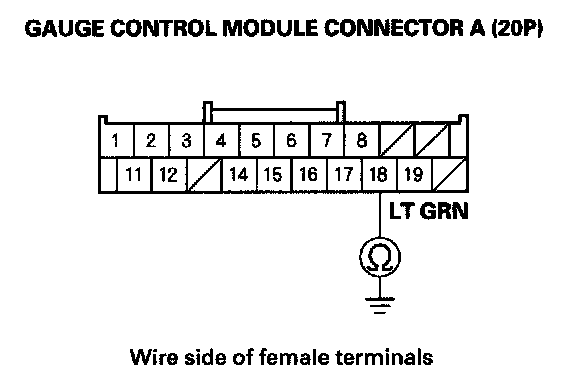 13. Check for continuity between gauge control module connector A (20P) terminal No. 18 and body ground.