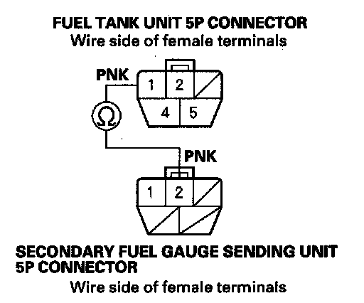 14. Check for continuity between fuel tank unit 5P connector terminal No. 1 and secondary fuel gauge sending unit 5P connector terminal No. 2.
