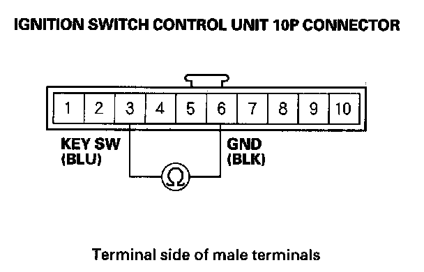10. With the build-in key inserted, check for continuity between ignition switch control unit 10P connector terminals No. 3 and No. 6.