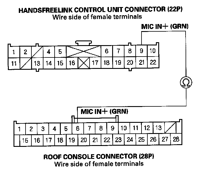 10. Check for continuity between HandsFreeLink control unit 22P connector No. 9 terminal and roof console 28P connector No. 6 terminal.
