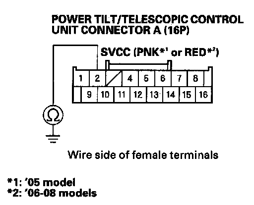 9. Check for continuity between power tilt/telescopic control unit connector A (16P) terminal No. 2 and body ground.