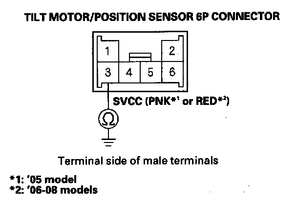 11. At the sensor side, check for continuity between tilt motor/position sensor 6P connector terminal No. 3 and body ground (motor body).