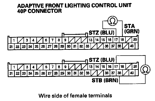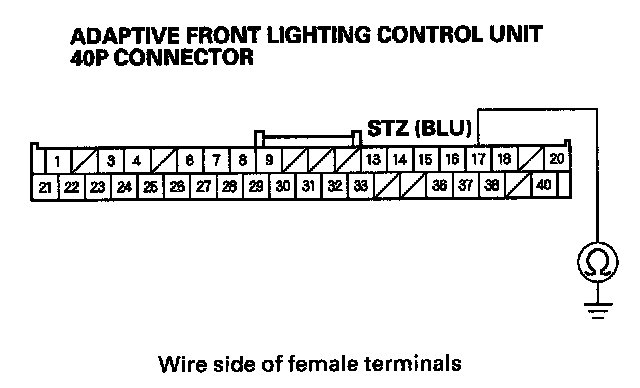 13. Check for continuity between the adaptive front lighting control unit 40P connector terminal No. 17 and body ground.