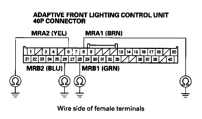 17. Check for continuity between body ground and adaptive front lighting control unit 40P connector terminals No. 31, No. 32, and No. 33 individually.