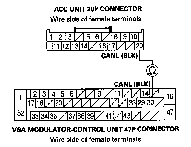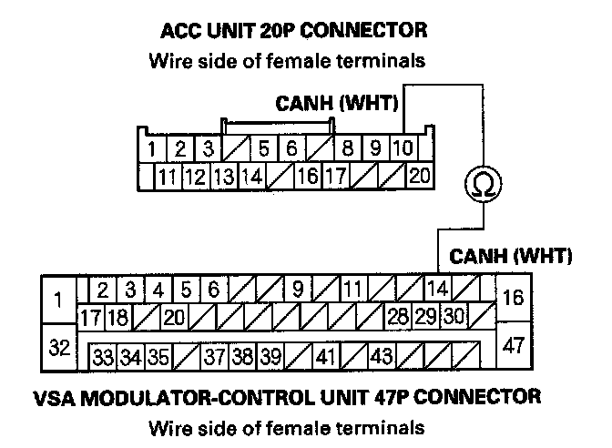 8. Check for continuity between the ACC unit 20P connector No. 10 terminal and the VSA modulator-control unit 47P connector No. 14 terminal.