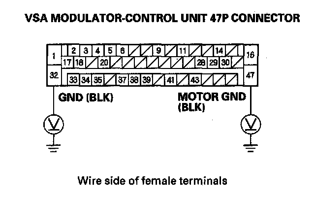 7. Measure the voltage between body ground and VSA modulator-control unit 47P connector terminals No. 32 and No. 47 individually.