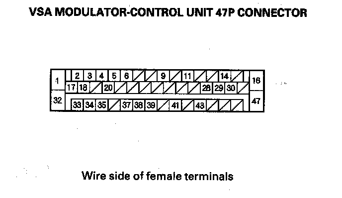 7. Check for continuity between the appropriate wheel sensor +B terminal and other wheel sensor (B), terminals of the VSA modulator-control unit 47P connector (see table).