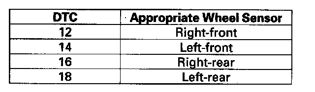 DTC 12, 14, 16, 18: Wheel Sensor (Electrical Noise/intermittent Interruption)NOTE: If the ABS indicator comes on because of electrical noise, the indicator goes off when you test-drive the vehicle at 19 mph (30 km/h).