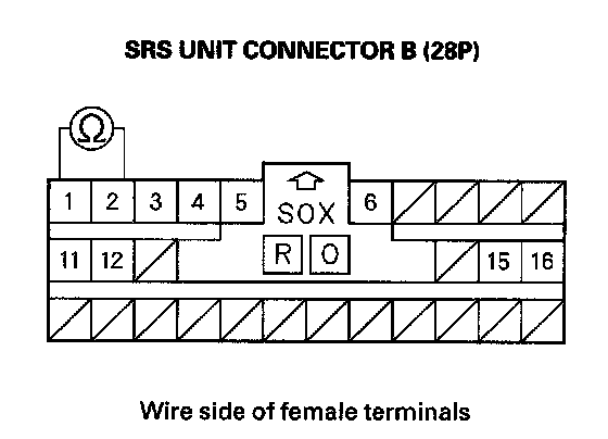 12. Measure the resistance between the No. 1 and the No. 2 terminals of SRS unit connector B (28P). There should be 2.0 - 3.0 ohms.