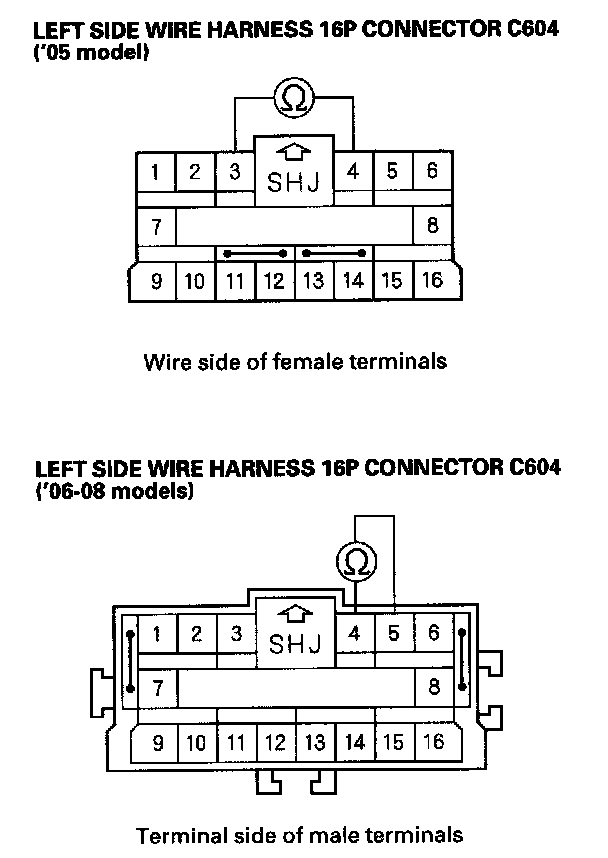 14. Measure the resistance between the No. 3 [No. 4] and No. 4 [No. 5] terminals of the left side wire harness 16P connector C604. There should be 2.0-3.0 ohms.
