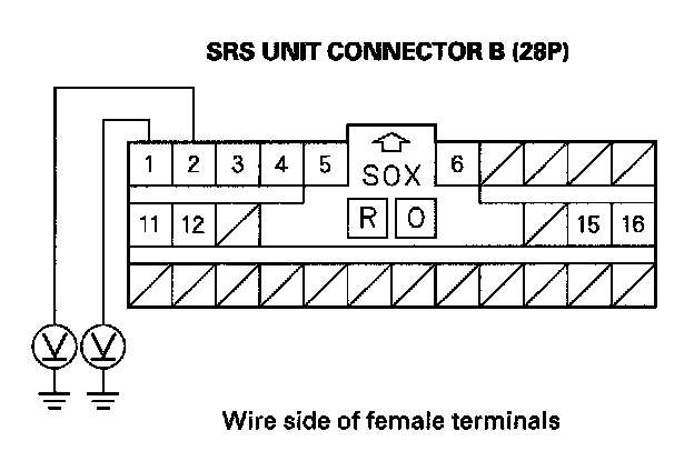 15. Measure the voltage between the No. 1 terminal of SRS unit connector B (28P) and body ground, and between the No. 2 terminal and body ground. There should be 0.5 V or less.