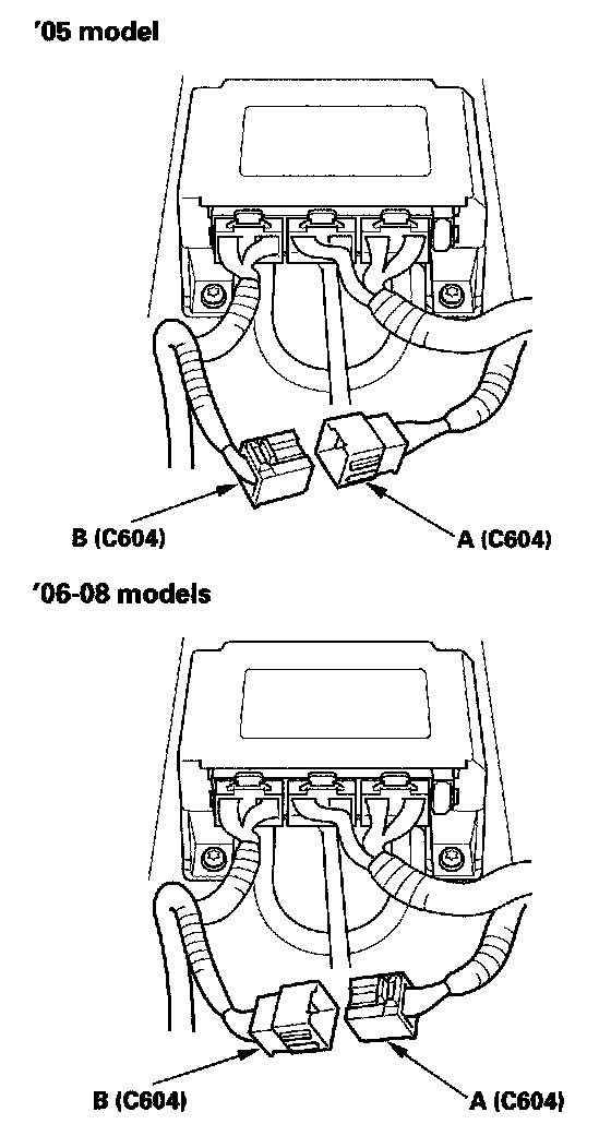 16. Disconnect right side wire harness 16P connector C604 (A) from the left side wire harness connector C604 (B).