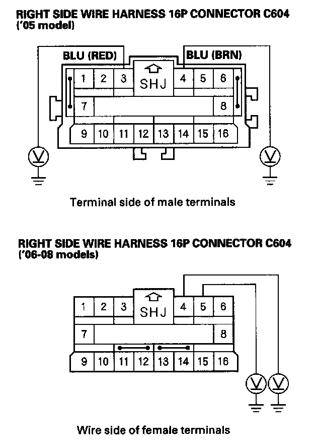 17. Measure the voltage between the No. 3 [No. 4] terminal of the right side wire harness 16P connector C604 and body ground, and between the No. 4 [No. 5] terminal and body ground. There should be 0.5 V or less.