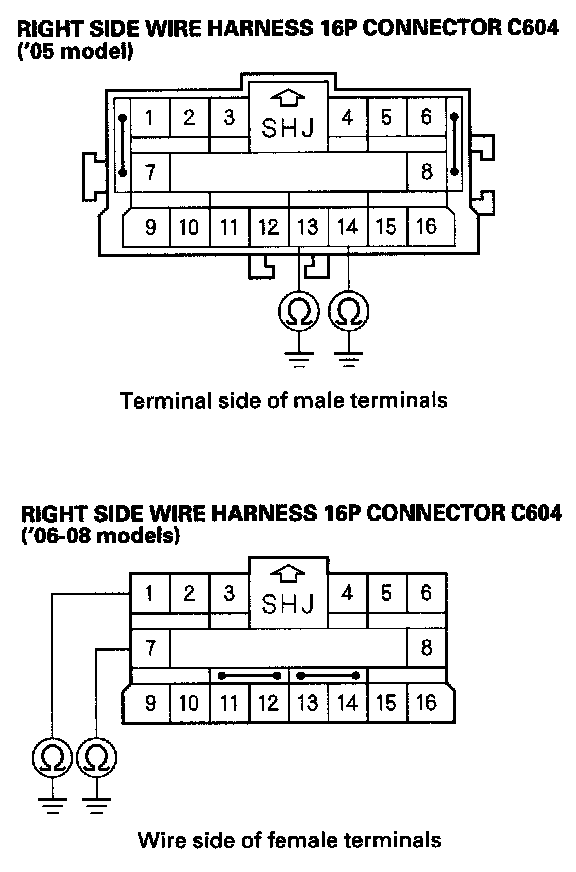 15. Measure the resistance between the No. 13 [No. 1] terminal of the right side wire harness 16P connector C604 and body ground, and between the No. 14 [No. 7] terminal and body ground. There should be an open circuit or at least 1 Mohms.