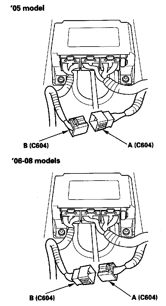 13. Disconnect right side wire harness 16P connector C604 (A) from the left side wire harness connector C604 (B).
