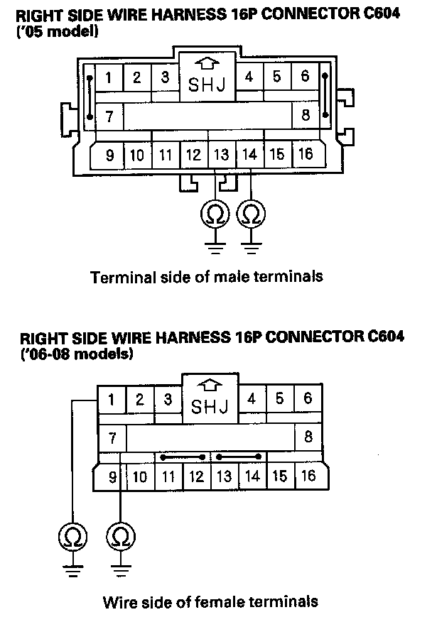 14. Measure the resistance between the No. 13 [No. 1] terminal of the right side wire harness 16P connector C604 and body ground, and between the No. 14 [No. 7] terminal and body ground. There should be an open circuit or at least 1 Mohms.
