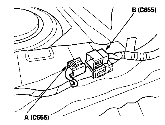 14. Disconnect right side wire harness 16P connector (A) C655 from left side wire harness connector (B) C655.