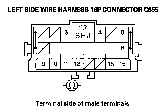 15. Measure the resistance between the No. 11 and No. 12 terminals of left side wire harness 16P connector C655. There should be an open circuit or at least 1 Mohms.