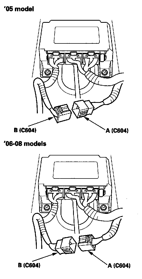 16. Disconnect right side wire harness 16P connector C604 (A) from left side wire harness connector C604 (B).