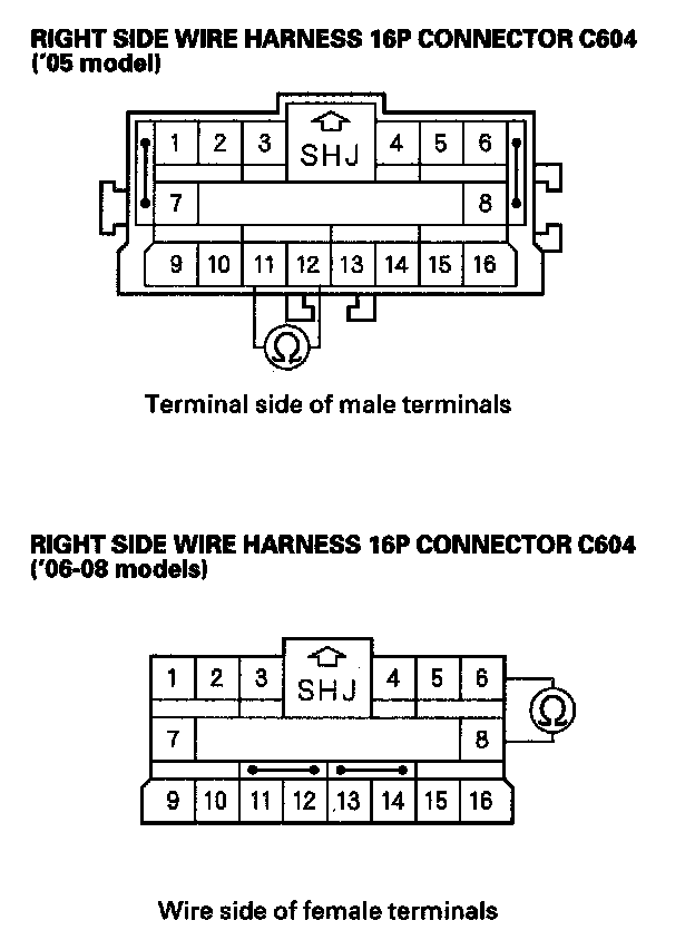 17. Measure the resistance between the No. 11 [No. 6] and No. 12 [No. 8] terminals of the right side wire harness 16P connector C604. There should be an open circuit or at least 1 Mohms.