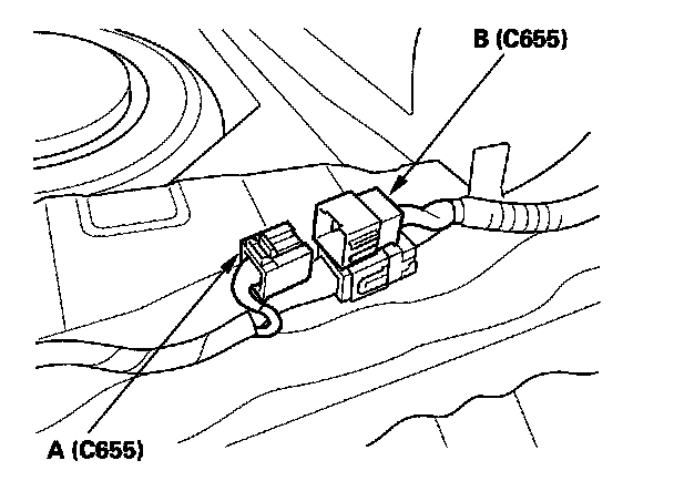 13. Disconnect right side wire harness 16P connector C655 (A) from left side wire harness connector C655 (B).