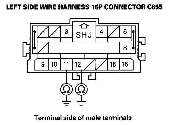 14. Measure the resistance between the No. 11 terminal of left side wire harness 16P connector C655 and body ground, and between the No. 12 terminal and body ground. There should be an open circuit or at least 1 Mohms.