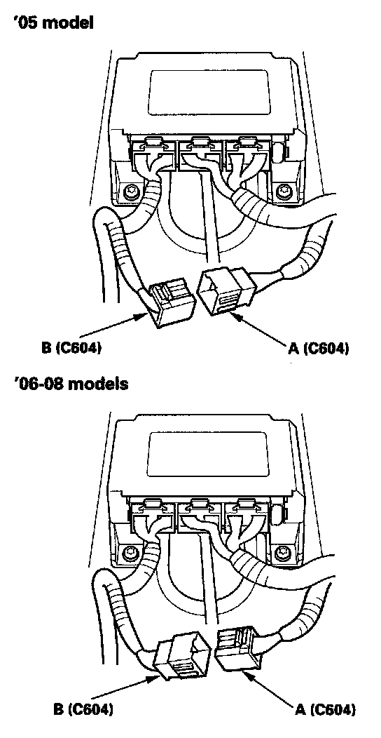 15. Disconnect right side wire harness 16P connector C604 (A) from left side wire harness connector C604 (B).