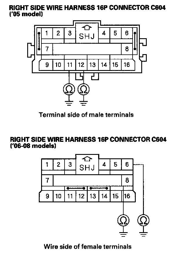 16. Measure the resistance between the No. 11 [No. 6] terminal of right side wire harness 16P connector C604 and body ground, and between the No. 12 [No. 8] terminal and body ground. There should be an open circuit or at least 1 Mohms.