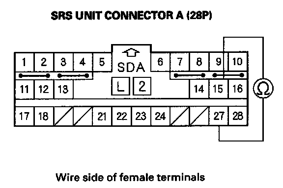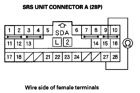 15. Measure the resistance between the No. 15 and No. 27 terminals of SRS unit connector A (28P). There should be 0-1.0 ohm.