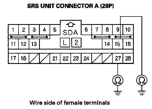 9. Measure the resistance between the No. 15 terminal of SRS unit connector A (28P) and body ground, and between the No. 27 terminal and body ground. There should be an open circuit or at least 1 Mohms.