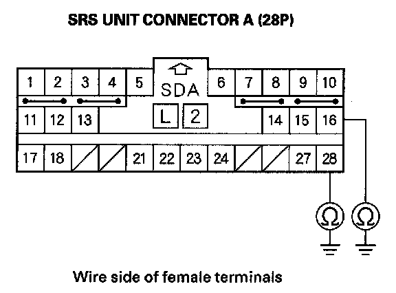 9. Measure the resistance between the No. 16 terminal of SRS unit connector A (28P) and body ground, and between the No. 28 terminal and body ground. There should be an open circuit or at least 1 Mohms.