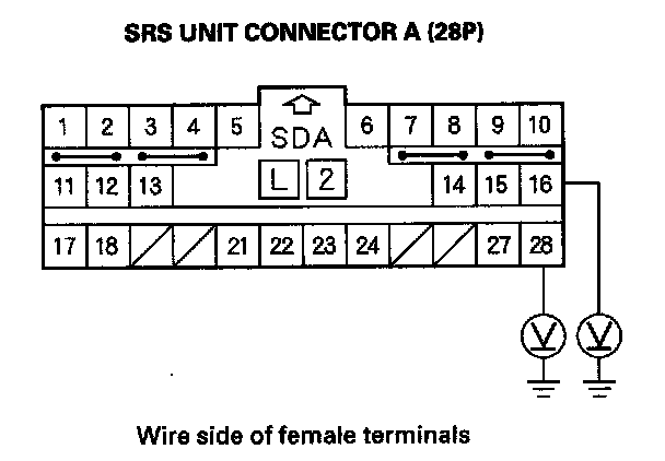 12. Measure the voltage between the No. 16 terminal of SRS unit connector A (28P) and body ground, and between the No. 28 terminal and body ground. There should be 1 V or less.
