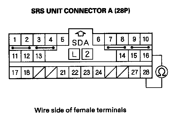 15. Measure the resistance between the No. 16 and No. 28 terminals of SRS unit connector A (28P). There should be 0-1.0 ohm.