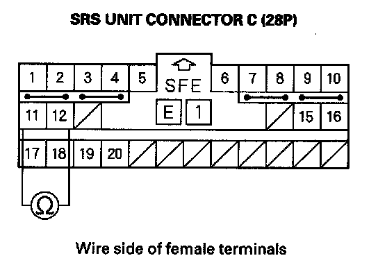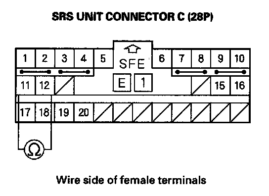14. Measure the resistance between the No. 11 and No. 12 terminals of SRS unit connector C (28P). There should be 1.0 ohm or less.