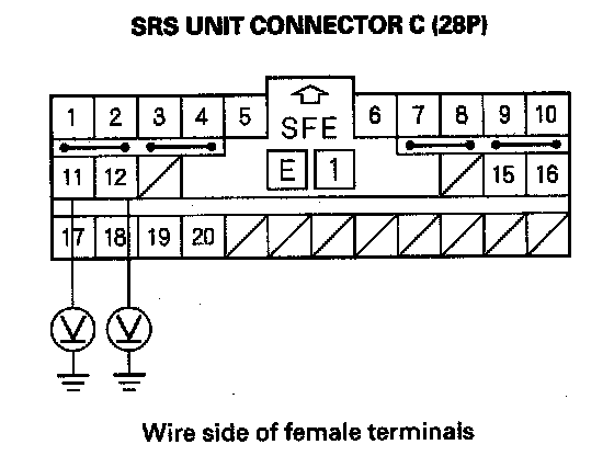 8. Measure the resistance between the No. 11 terminal of SRS unit connector C (28P) and body ground, and between the No. 12 terminal and body ground. There should be an open circuit or at least 1 Mohms.