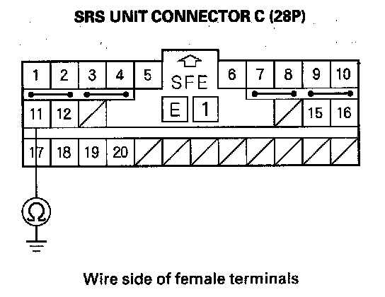 6. Measure the resistance between the No. 11 terminal of SRS unit connector C (28P) and body ground. There should be an open circuit or at least 1 Mohms.