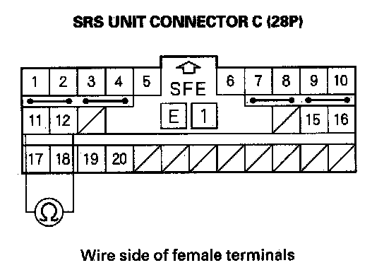 7. Measure the resistance between the No. 11 and No. 12 terminals of SRS unit connector C (28P). There should be an open circuit or at least 1 Mohms.