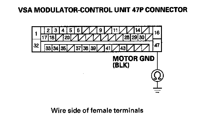 7. Check for continuity between the VSA modulator control unit 47P connector terminal No. 47 and body ground.