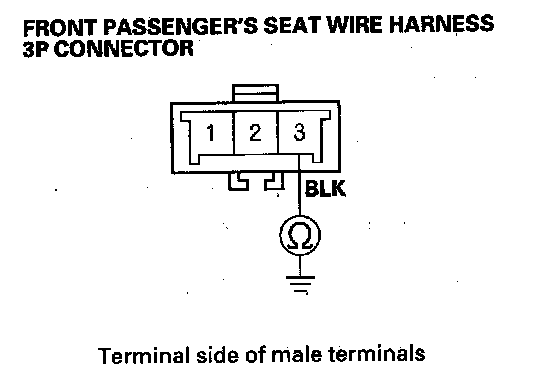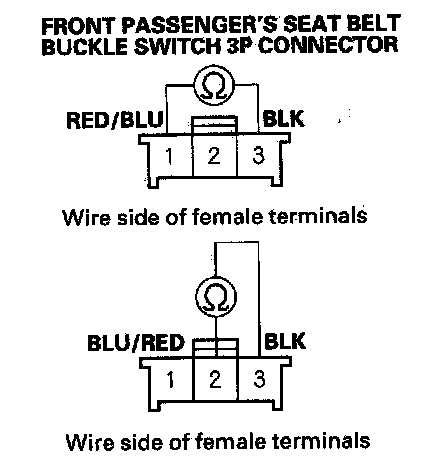 - Measure the resistance between the No. 1 and No. 3 terminals of the front passenger's seat belt buckle switch 3P connector, There should be 0-1 ohm.