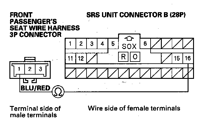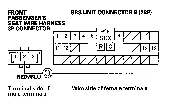 12. Measure the resistance between the No. 16 terminal of SRS unit connector B (28P) and the No. 1 terminal of the front passenger's seat wire harness 3P connector. There should be 0-1 ohm.