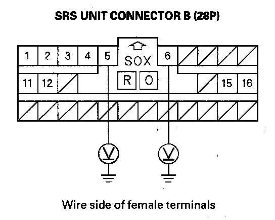 7. Measure the voltage between the No. 5 terminal of SRS unit connector B (28P) and body ground, and between the No. 6 terminal and body ground. There should be 1 V or less.