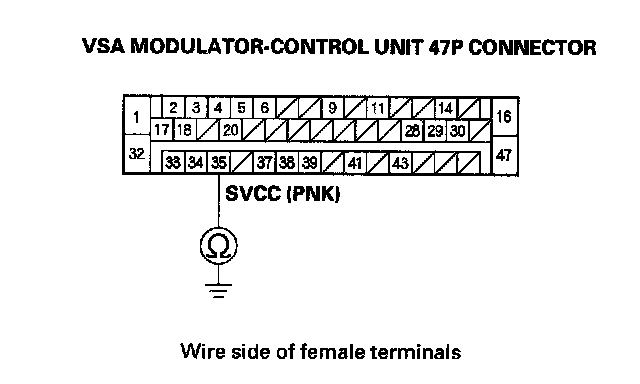 9. Check for continuity between the VSA modulator control unit 47P connector terminal No. 35 and body ground.