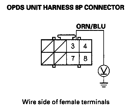 6. Measure the voltage between the No. 3 terminal of the OPDS unit harness 8P connector and body ground. There should be battery voltage.
