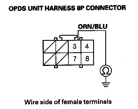 9. Measure the resistance between the No. 3 terminal of the OPDS unit harness 8P connector and body ground. There should be an open circuit or at least 1 Mohms.