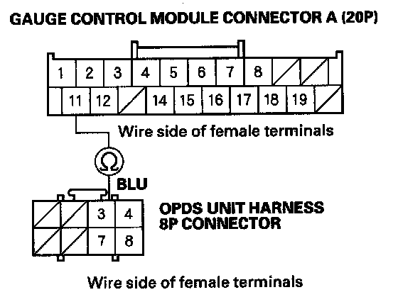 10. Measure the resistance between the No. 3 terminal of the OPDS unit harness 8P connector and the No. 11 terminal of gauge control module connector A (20P). There should be 0-1.0 ohm.