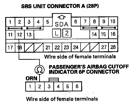 6. Measure the resistance between the No. 2 terminal of the passenger's airbag cutoff indicator 6P connector and the No. 12 terminal of SRS unit connector A (28P). There should be 0-1.0 ohm.