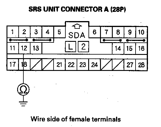7. Measure the resistance between the No. 12 terminal of the SRS unit connector A (28P) and body ground. There should be an open circuit or at least 1 Mohms.