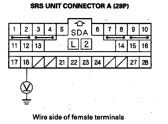 15. Measure the voltage between the No. 18 terminal of SRS unit connector A (28P) and body ground. There should be battery voltage.